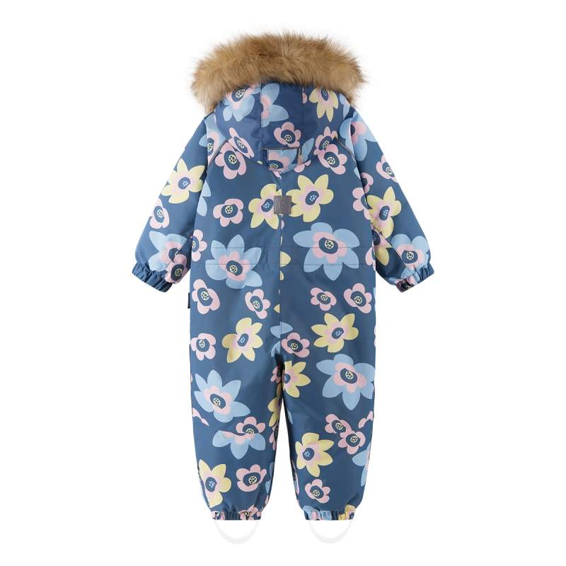 A detachable hood with removable faux fur, adjustable waist, durable silicone foot loops, and elastic cuffs provide safety and comfort. Compatible with Reima Play Layers innerwear system.