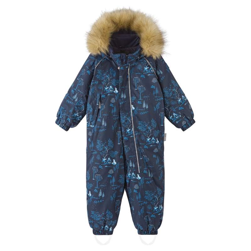 A detachable hood with removable faux fur, adjustable waist, durable silicone foot loops, and elastic cuffs provide safety and comfort. Compatible with Reima Play Layers innerwear system.
