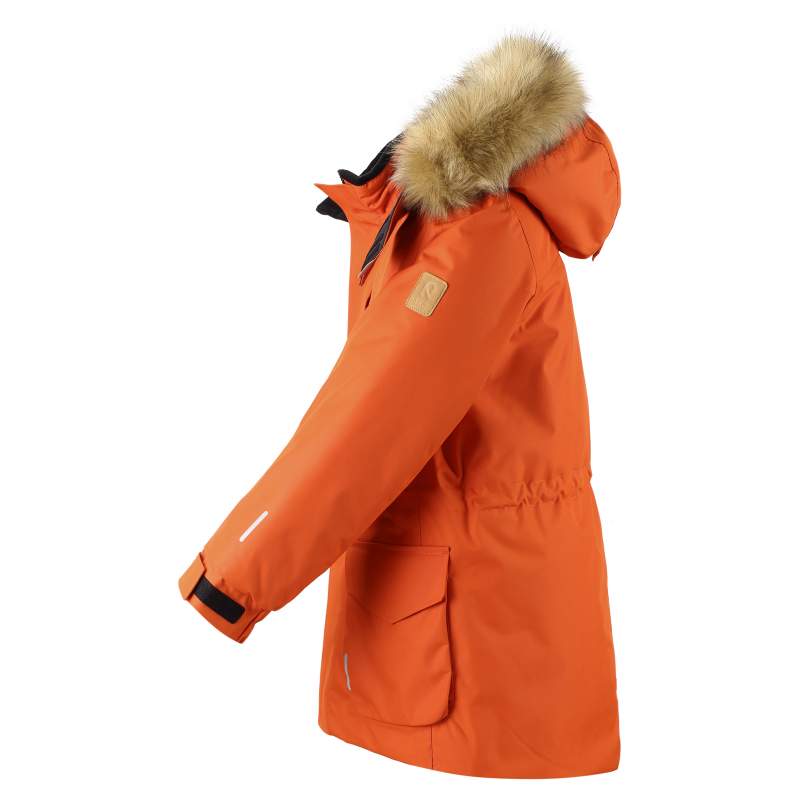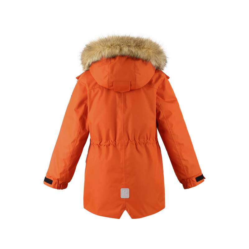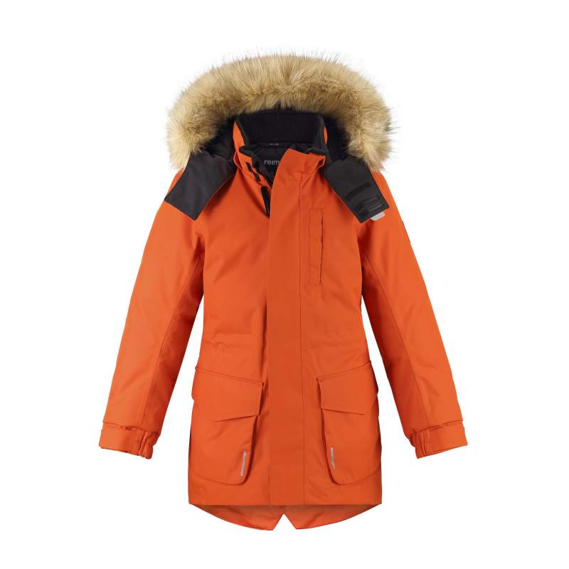 Модель удлинённая, с гладкой подкладкой из переработанных волокон. Капюшон съёмный и регулируемый, с отстёгивающейся искусственной меховой опушкой. Регулировка по талии и манжетам обеспечивает отличную посадку. Начиная с размера 116, предусмотрен внутренний карман на молнии, а два внешних накладных кармана удобны для хранения мелочей.